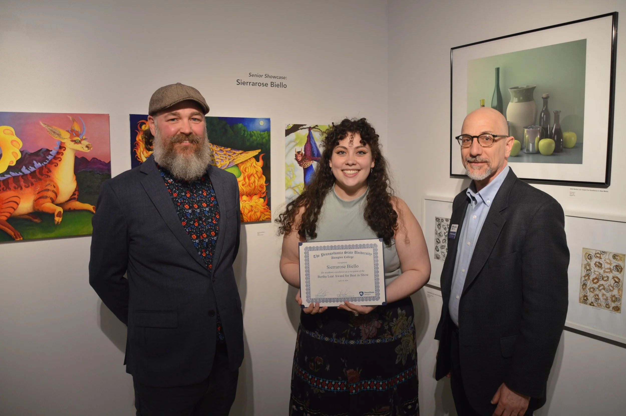 Photo of Sierrarose with Professor H. Thompson (left) and Interim Chancellor Andrew August (right). Credit: Penn State.